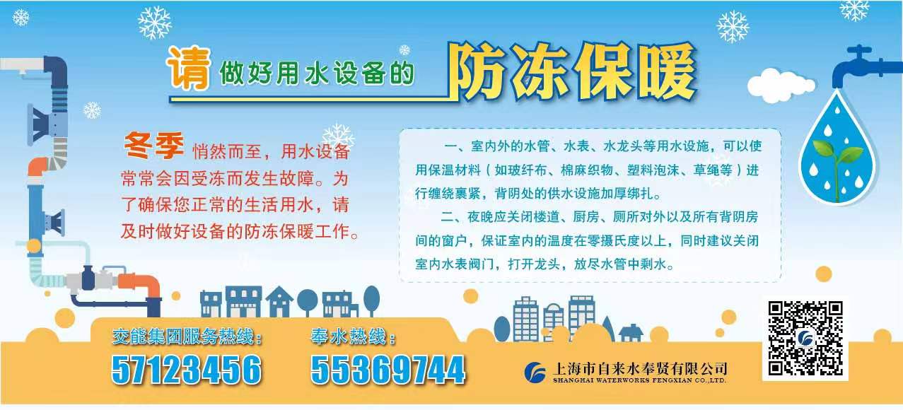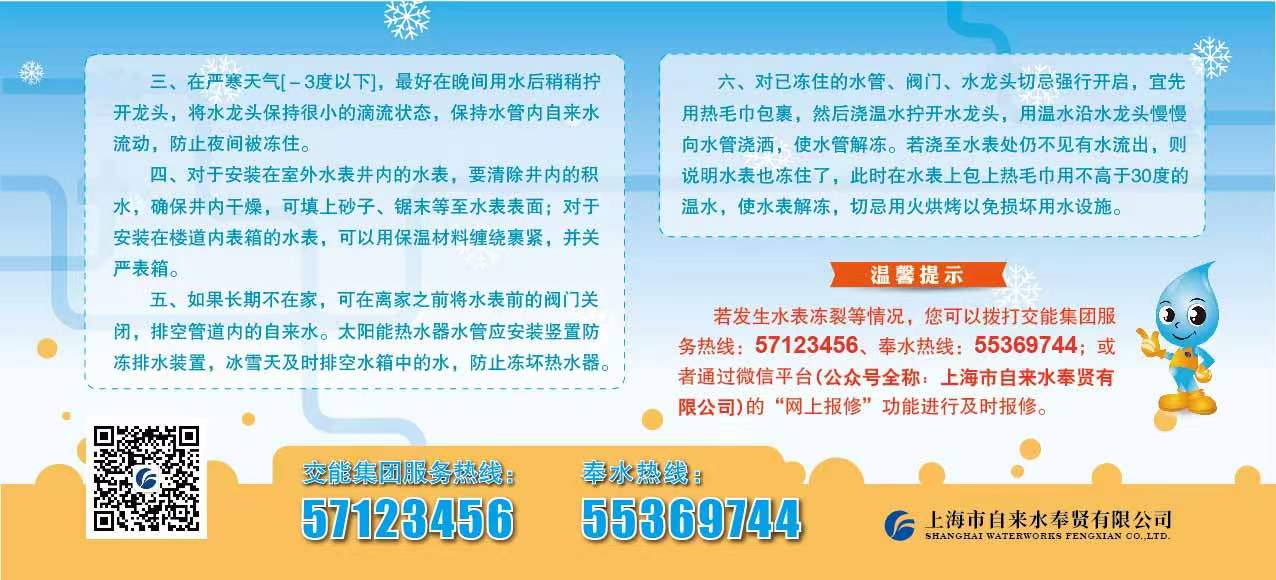 温馨提示:若发生水表冻裂等情况,您可以拨打交能集团服务热线:57123456、奉水热线:55369744;或者通过微信平台(公众号全称:上海市自来水奉贤有限公司)的“网上报修”功能进行及时报修。